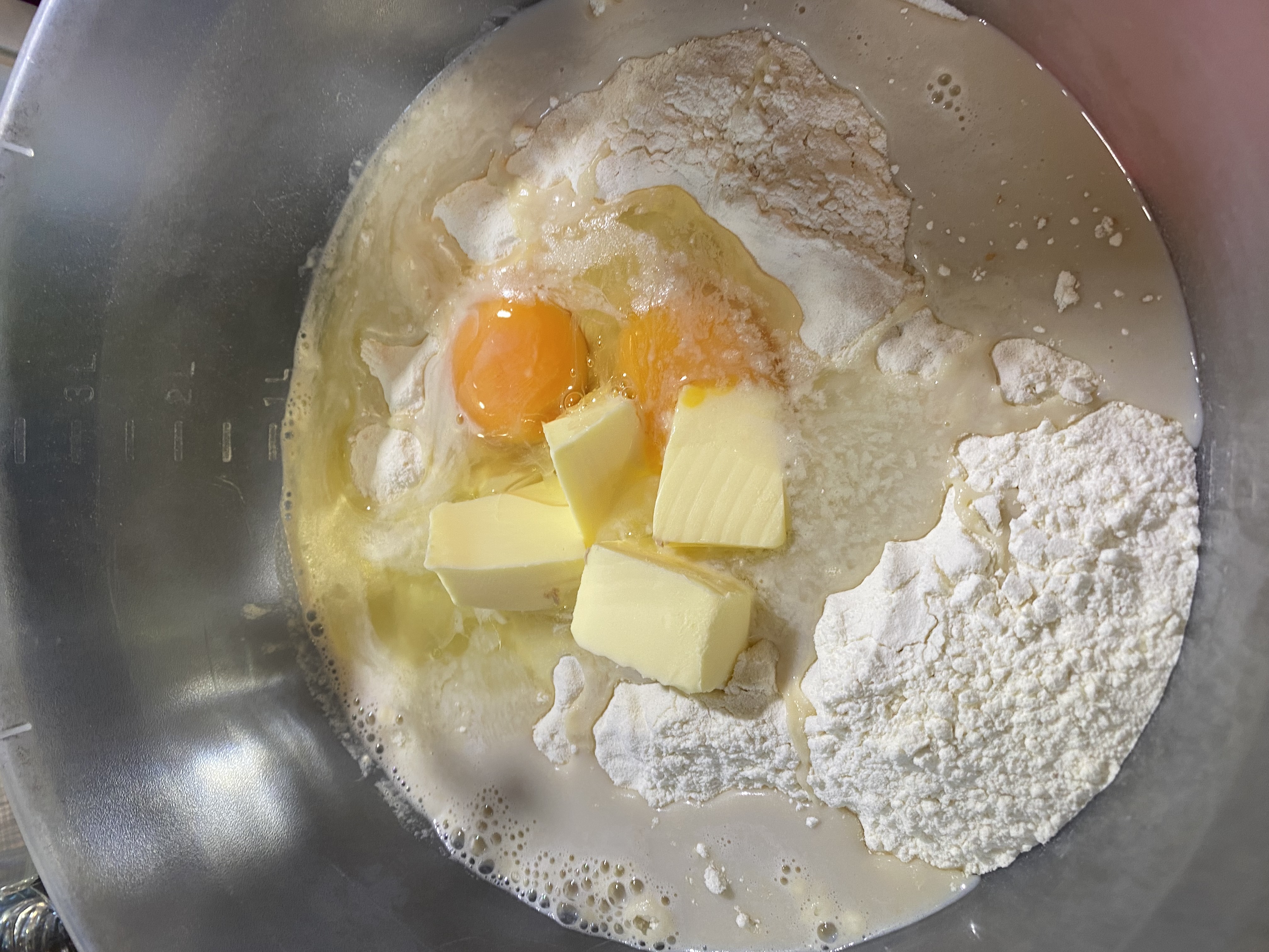 Den Zucker für den Teig in der lauwarmen Milch auflösen.Die Hefe zerbröseln und in die Milch streuen.Fünf Minuten ruhen lassen. Anschließend das Mehl in eine Rührschüssel geben und eine Mulde formen,die Hefemilch dort hinein geben.Die restlichen Zutaten für de Teig hinzufügen und zu einem Teig kneten.